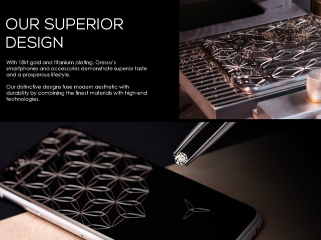 Gresso Diva โดดเด่นด้วยสไตล์เรียบหรูและลายที่สร้างความต่างจากสมาร์ทโฟนรุ่นอื่นๆ ที่ตัวเครื่องแค่สีชมพูเท่านั้น ทาง Gresso ได้นำเครื่อง iPhone 7 มาฉาบไทเทเนียมสีดำด้านหลัง แกะลายเรขาคณิตหรือลายพาสลีย์ (ลายลูกน้ำ) และประดับด้วยเพชร .01 กะรัต 11 เม็ด พร้อมทองหรือทองคำขาว 18 กะรัต ที่สำคัญผลิตขึ้นมาเพียง 999 เครื่องเท่านั้น และแต่ละเครื่องใช้เวลาผลิตนานถึง 18 ชั่วโมงเลยทีเดียวค่ะ โดยราคาเริ่มต้นอยู่ที่ $5,900 ถ้าคิดเป็นเงินไทยประมาณ 208,990 บาท หากใครสนใจสามารถเข้าไปดูได้ที่เว็บไซต์ gresso.com