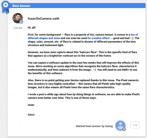 ทาง Google ได้ให้คำตอบสำหรับปัญหานี้ว่า ภายหลังจากนี้จะมีการปล่อยอัพเดทแก้ไขในส่วนของ Software เพื่อแก้ปัญหาเลนส์แฟร์ในโหมด HDR+ ต้องมารอดูกันครับว่า เมื่ออัพเดทแล้วปัญหานี้จะถูกแก้ไขได้จริงหรือเปล่า?
