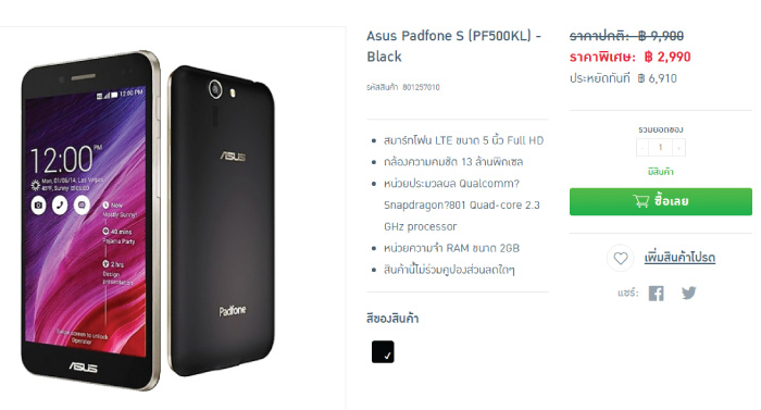 ล่าสุด ASUS Padfone S ลดราคาเพื่อระบายสินค้าแล้วครับ ในราคาเพียง 2,990 บาทเท่านั้น และเท่าที่ทราบมามีจำนวนจำกัดด้วย เหลืออีกไม่มากแล้ว ถือว่าคุ้มมากเลยทีเดียว ซึ่งจำกัดการซื้อได้คนละ 1 เครื่องเท่านั้น ส่วนตัวคนที่บ้านผมก็ยังใช้งานอยู่ (ซื้อมาตั้งแต่วางจำหน่ายช่วงแรกๆ) หากใครสนใจก็สามารถเข้าไปสั่งซื้อได้ที่เว็บไซต์ shopat24