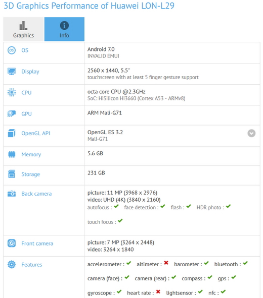 จากข้อมูลของ GFXBench benchmark นั้น Huawei P10 จะทำงานบน Android 7.0 Nougat, มาพร้อมขนาดหน้าจอ 5.5 นิ้วความละเอียด QHD 1440 x 2560 pixels, ชิปเซ็ต Kirin 960, CPU octa-core 2.3GHz, GPU Mali G-71, RAM 6GB, หน่วยความจำภายใน 256GB สำหรับรหัสของสมาร์ทโฟนรุ่นนี้ คือ LON-L29 ซึ่งคาดว่าน่าจะเป็น Huawei P10 แน่นอนเพราะ Huawei P9 ก็ใช้รหัสว่า LON-L19