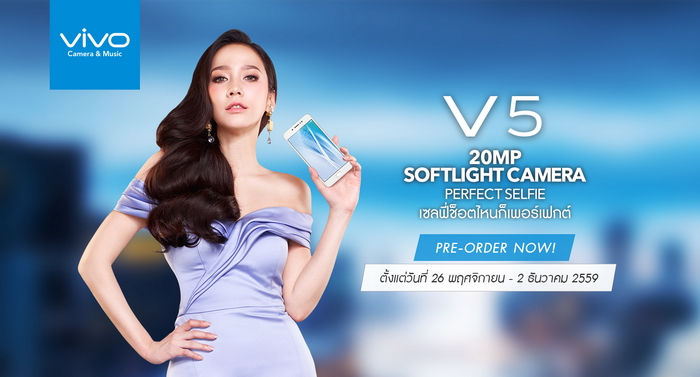 เปิดตัวแล้วสำหรับ Vivo V5 และพรีเซนเตอร์ อั้ม พัชราภา ซุปเปอร์สตาร์อันดับ 1 ของประเทศไทย โดยจุดเด่นของ Vivo V5 ประกอบด้วยระบบเซ็นเซอร์กล้องหน้าที่ให้ความละเอียดสูงถึง 20 ล้านพิกเซล มาพร้อมกับแสงแฟลชที่นุ่มนวล แบบพิเศษ เรียกว่า Softlight ช่วยให้การเซลฟี่สว่างสดใส ผิวขาวอมชมพูเปล่งประกายอย่างเป็นธรรมชาติ Vivo ได้คิดค้นเทคโนโลยีโหมดใบหน้าสวย เวอร์ชั่น 6.0 ทำให้การเซลฟี่เป็นธรรมชาติมากกว่าเดิม