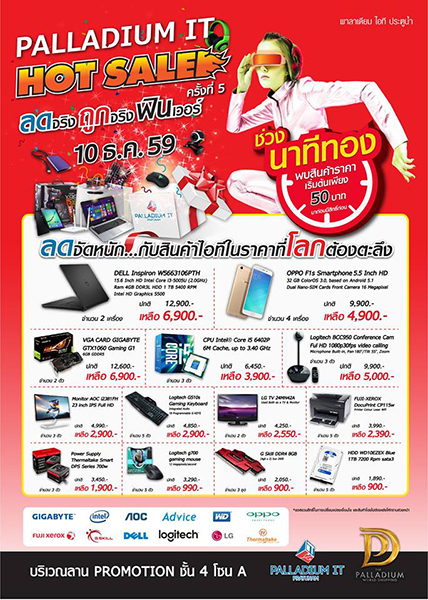ลดโลกตะลึงส่งท้ายปี PALLADIUM IT HOT SALE ครั้งที่ 5 ครั้งสุดท้ายของปี ลดจริง ถูกจริง ฟินเวอร์ พบกับทัพสินค้าไอทีแบรนด์ชั้นนำ อาทิ DELL, Intel, GIGABYTE, Fuji Xerox, OPPO, Thermaltake และ Advice เป็นต้น ที่พร้อมใจกันนำสินค้ามาลดสูงสุดถึง 70% เช่น