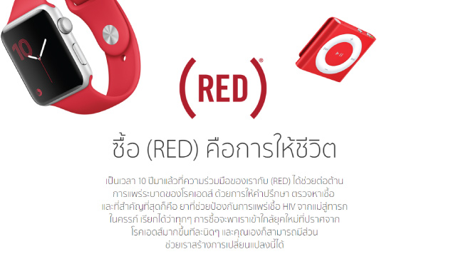สำหรับ Product Red ของ Apple เป็นความร่วมมือกับองค์กร Red เพื่อต่อต้านการแพร่ระบาดของโรคเอดส์ ด้วยการให้คำปรึกษา ตรวจหาเชื้อ และที่สำคัญที่สุดก็คือ ยาที่ช่วยป้องกันการแพร่เชื้อ HIV จากแม่สู่ทารกในครรภ์ ซึ่งการซื้อสินค้า Product Red ของ Apple ก็เป็นการบริจาคอีกช่องทางหนึ่งด้วยนะครับ ผมเองก็เคยซื้อเคสสำหรับ iPad ในโครงการนี้เช่นกัน โดยตลอด 10 ปีมานี้ Product Red สามารถสร้างรายได้ถึง 120 ล้านเหรียญ โดยมีการมอบรายได้ให้กับกองทุนต่างๆ ทั่วโลก