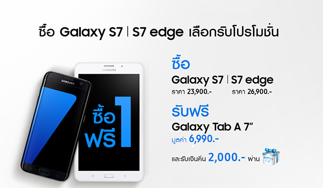 เมื่อซื้อ Samsung Galaxy S7 หรือ S7 edge รับฟรีทันทีแท็บเล็ต Samsung Galaxy Tab A7 มูลค่า 6,990 บาท พร้อมรับ Cash Back มูลค่า 2,000 บาท รวมมูลค่า 8,990 บาท (ของแถมมีจำนวนจำกัด และมีเฉพาะร้านค้าที่ร่วมรายการ)