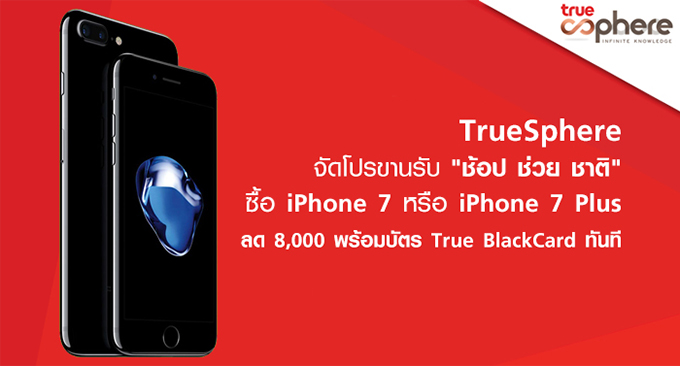 TrueSphere จัดโปรขานรับ "ช้อป ช่วย ชาติ" เพียงซื้อ iPhone 7 หรือ iPhone 7 Plus ลด 8,000 บาท พร้อมรับบัตร True BlackCard ทันที พบเอกสิทธิ์เหนือใครที่ TrueSphere ทั้ง 5 สาขา วันนี้ถึง 31 ธันวาคม 2559 เท่านั้น