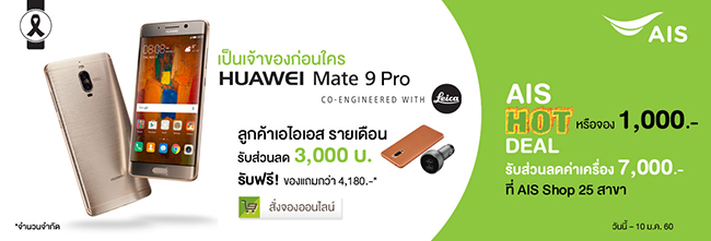 - ราคา 24,900 บาท สำหรับลูกค้าเอไอเอส แบบรายเดือน ที่จดทะเบียนในนามบุคคลธรรมดา ที่มีแพ็กเกจหลักค่าบริการรายเดือนตั้งแต่ 488 บาท ขึ้นไป และมีอายุการใช้งานตั้งแต่ 3 เดือนขึ้นไป สามารถซื้อเครื่องเปล่าในราคาพิเศษ เมื่อเซ็นสัญญาใช้บริการต่อเนื่องนาน 12 เดือน โดยมีรายละเอียดดังนี้ - สำหรับลูกค้า AIS Hot Deal จองเครื่อง Huawei Mate 9 Pro ผ่าน AIS Shop 25 สาขาที่ร่วมรายการ เพียงชำระเงินจองค่าเครื่อง 1,000 บาท
