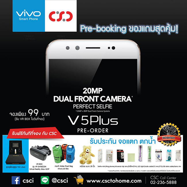 เมื่อจอง Vivo V5 Plus กับทาง TG Fone จะได้รับแถมสุดพิเศษ ดังนี้