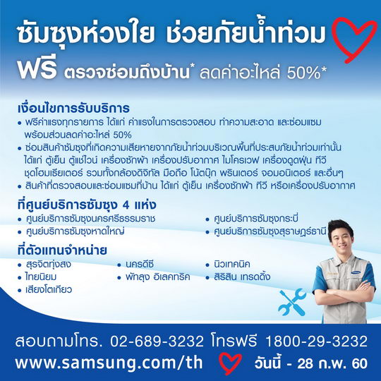"ซัมซุงห่วงใย ช่วยภัยน้ำท่วม" ซ่อมสินค้า Samsung ทุกชนิด ฟรีค่าแรง ลดค่าอะไหล่ 50% ถึง 28 ก.พ.นี้
