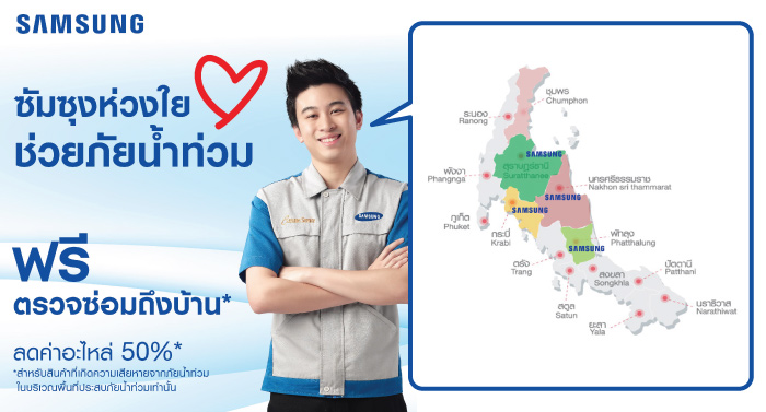 Samsung เดินหน้าช่วยเหลือผู้ประสบอุทกภัย สานต่อโครงการ "ซัมซุงห่วงใย ช่วยภัยน้ำท่วม" มอบบริการพิเศษช่วยเหลือประชาชนที่เครื่องใช้ไฟฟ้าได้รับความเสียหายจากอุทกภัย ซ่อมสินค้า Samsung "ฟรีค่าแรง ลดค่าอะไหล่ 50%" ครอบคลุมพื้นที่ประสบภัยน้ำท่วม 5 จังหวัดภาคใต้ ได้แก่ ชุมพร สุราษฎร์ธานี นครศรีธรรมราช กระบี่ และพัทลุง ตั้งแต่วันนี้จนถึงวันที่ 28 กุมภาพันธ์นี้