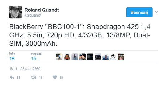 ใครที่เป็นแฟนคลับ BlackBerry และรอคอยการมาของสมาร์ทโฟนที่รองรับ 2 ซิม ของแบรนด์นี่้อยู่มีเฮละครับ เพราะล่าสุดมีการเปิดเผยจาก Roland Quandt (@rquandt) ว่า BlackBerry จะเปิดตัวสมาร์ทโฟนที่รองรับการใช้งาน 2 ซิม โดยใช้ชื่อรหัส BBC100-1 ออกมา ซึ่งมีรายละเอียดว่าจะใช้ชิปเซ็ต Snapdragon 425, หน้าจอขนาด 5.5 นิ้ว ความละเอียด HD 720P, RAM 4GB, หน่วยความจำ 32GB, กล้องความละเอียด 13MP และกล้องหน้าความละเอียด 8MP, และมาพร้อมแบตเตอรี่ความจุ 3,000 mAh