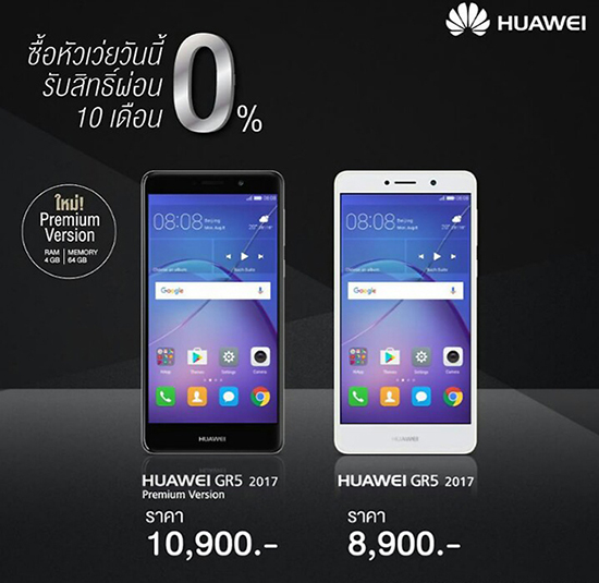 Huawei ประเทศไทย เผลอปล่อยภาพโปรโมชั่น Huawei GR5 2017 สมาร์ทโฟนกล้องคู่ ราคาเบาๆ ออกมาครับ แต่ความน่าสนใจอยู่ตรงที่จะมีรุ่นพิเศษ ในชื่อ Huawei GR5 2017 Premium version โดยราคาระบุไว้ 10,900 บาท โดยรุ่นพิเศษนี้จะได้ RAM 4GB และหน่วยความจำภายในเป็น 64GB (รุ่นปกติ RAM 3GB และหน่วยความจำ 32GB) แถมยังสามารถเพิ่ม Micro SD Card ได้ตามปกติอีกด้วย