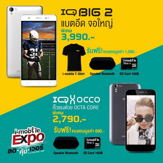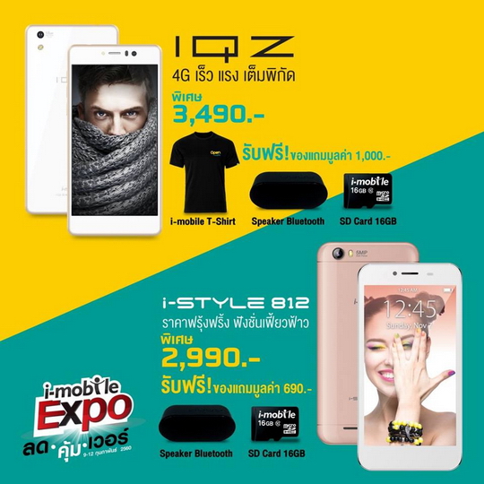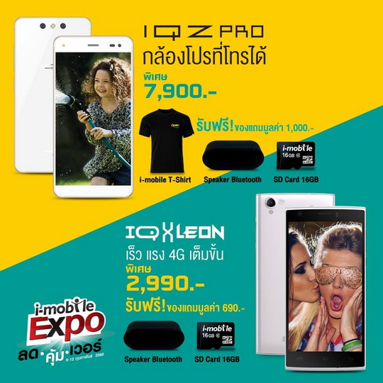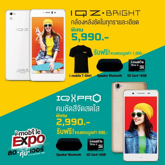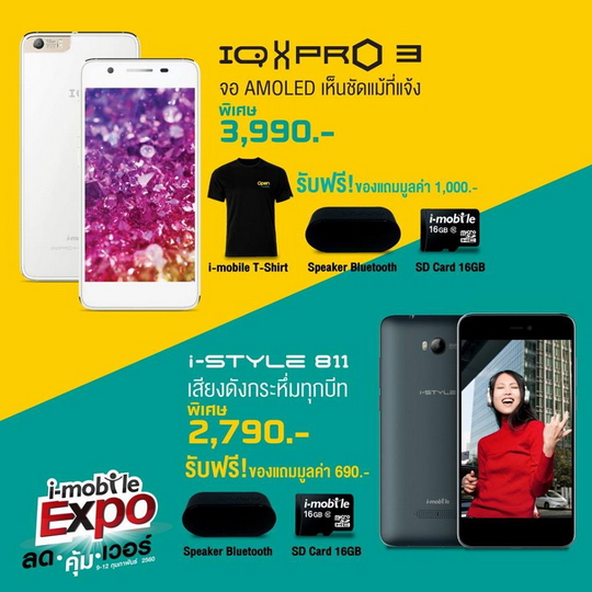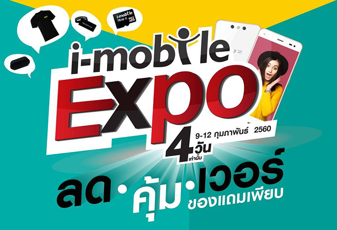 i-mobile Expo "ลด คุ้ม เวอร์" ยกขบวนมือถือ i-mobile ฟังก์ชันครบครัน ราคาสุดคุ้ม กว่า 10 รุ่น ออกมาให้จับจองราคาพิเศษ พร้อมของแถมมากมายมูลค่า 1,000 บาท ไม่ว่าจะเป็น เสื้อยืดสุดเท่ ลำโพง bluetooth ดีไซน์เก๋ และ Memory card 16GB แล้วพบกันได้ที่ร้าน Open by i-mobile ทุกสาขาทั่วประเทศ ตั้งแต่วันนี้ - 12 กุมภาพันธ์ 2560