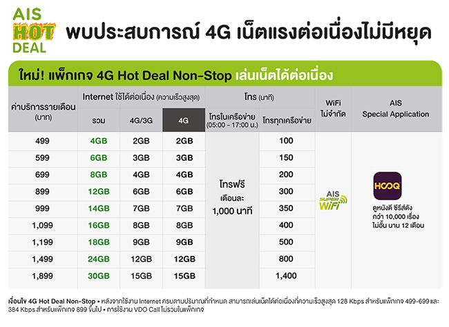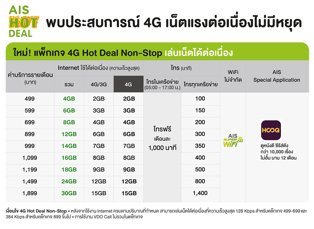 - แพ็กเกจค่าบริการล่วงหน้าตามที่ชำระ จะถูกแบ่งหักเป็นส่วนลดค่าบริการรายเดือน 10 เดือน เริ่มมีผลรอบบิลที่ 2 เป็นต้นไป