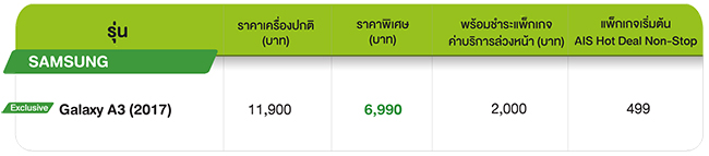 Samsung Galaxy A3 (2017) สมาร์ทโฟนรุ่นเล็กจากตระกูล A ที่หลายๆ คนถามหา สามารถซื้อได้แล้วในราคาพิเศษแบบ Exclusive ที่ AIS เท่านั้น เพียงแค่ 6,990 บาท (จากปกติ 11,900 บาท) เมื่อสมัครแพ็กเกจ 499 ระยะสัญญา 12 เดือน พร้อมจ่ายล่วงหน้าค่าแพ็กเกจ 2,000 บาท และจะได้รับเป็นส่วนลดเดือนละ 200 บาท นาน 10 เดือน โดยสามารถหาซื้อได้แล้วที่ AIS ทั่วประเทศ