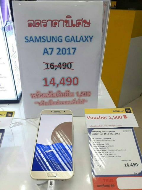 Samsung Galaxy A7 (2017) สมาร์ทโฟนที่ครบเครื่องมากๆ อีกรุ่นหนึ่งของ Samsung ซึ่งเปิดตัวและวางจำหน่ายไปไม่นาน ล่าสุดปรับลดราคาเหลือเพียง 14,490 บาท (จากราคาเปิดตัว 16,490 บาท) พร้อม Voucher มูลค่า 1,500 บาท (หรือรับเป็นส่วนลดไปเลยก็ได้) นั้นเท่ากับว่า Samsung Galaxy A7 2017 จะเหลือเพียงแค่ 12,990 บาทเท่านั้นครับ ถือว่าลดราคาลงเยอะมากๆ