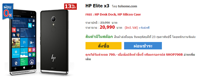HP Elite x3 สมาร์ทโฟนระดับพรีเมี่ยมระบบ Windows 10 Mobile ที่มุ่งเจาะกลุ่มลูกค้านักธุรกิจ ด้วยความสามารถ Continuum เชื่อมต่อกับ HP Desk Dock เพื่อทำงานเป็น PC ต่อเข้ากับหน้าจอได้เลย และมีโปรแกรมการทำงาน HP Workspace ช่วยให้การใช้งานสมบูรณ์แบบ โดยเปิดตัวในประเทศไทยเมื่อช่วงเดือนกันยายนปีที่ผ่านมา ในราคาวางจำหน่ายสูงถึง 29,900 บาท (แถม HP Desk Dock และ HP Silicon Case มาให้ในชุดจำหน่าย) แม้จะมาถึงในตอนนี้ก็ยังเป็นสมาร์ทโฟนระบบ Windows 10 Mobile สเปคสูงระดับแถวหน้าอยู่