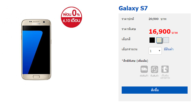 โดย Samsung Galaxy S7 ลดทันที 19% เหลือเพียง 16,900 บาทเท่านั้น (จากปกติ 20,900 บาท) มี 3 สีให้เลือก ได้แก่ สีดำ, ทอง, เงิน