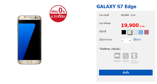 ขณะที่ Samsung Galaxy S7 edge ลดทันที 19% เหลือเพียง 19,900 บาท (จากปกติ 23,900 บาท) มีให้เลือก 5 สี ได้แก่ สีดำ, ทอง, เงิน, ฟ้า, ชมพู
