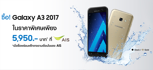 ซัมซุง จัดโปรโมชั่นพิเศษ Samsung Galaxy A (2017) ซื้อ Galaxy A5 2017 และ Galaxy A7 2017 วันนี้! รับส่วนลด พร้อมรับเงินคืนผ่าน Galaxy Gift Card มูลค่ารวมสูงสุดถึง 4,000 บาท แถมเปลี่ยนจอฟรีภายใน 1 ปี หากแตกหรือร้าว พร้อมด้วย Samsung Galaxy A3 (2017) ในราคาพิเศษเพียง 5,950 บาท เมื่อซื้อพร้อมแพ็กเจก AIS 4G Hot Deal Non-Stop เริ่มต้น 499 บาท (สัญญา 12 เดือน) ตั้งแต่วันนี้ - 31 มี.ค. 25560