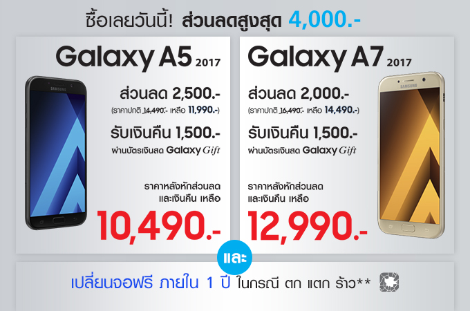 ซื้อ Samsung Galaxy A (2017) วันนี้! รับส่วนลดสูงสุดถึง 4,000 บาท แถมเปลี่ยนจอฟรีภายใน 1 ปี