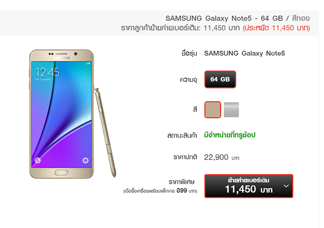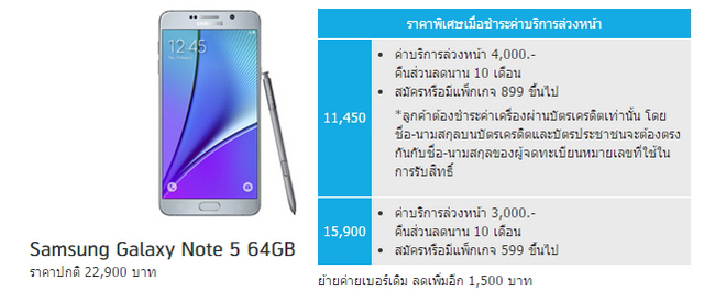 TrueMove H ลดราคา Samsung Galaxy Note 5 ความจุ 64GB สำหรับลูกค้าย้ายค่ายเบอร์เดิมเหลือ 13,900 บาท (จากราคาเต็ม 22,900 บาท) โดยต้องสมัครแพ็กเกจ 4G+ Super Smart 699 บาทต่อเดือนขึ้นไป ยาวนาน 12 เดือน และชำระค่าบริการล่วงหน้า 1,500 บาท ดูรายละเอียดเพิ่มเติมได้ที่เว็บไซต์ truemoveh.truecorp.co.th
