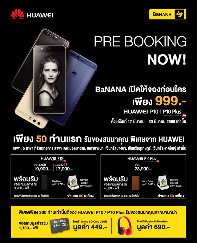 Banana ให้คุณเป็นเจ้าของ Huawai P10 และ P10 Plus ก่อนใคร จองและวางมัดจำเป็นจำนวนเงิน 999 บาท ได้ตั้งแต่วันที่ 17 - 30 มีนาคม 2560 รับของสมนาคุณพิเศษจาก Huawei เพียง 50 ท่านแรกเท่านั้น เฉพาะ Banana 5 สาขาที่ร่วมรายการ ได้แก่ เซ็นทรัลพลาซ่า สุราษฎร์ฯ, เซ็นทรัลเฟสติวัล หาดใหญ่, เดอะมอลล์ บางแค, เซ็นทรัลพลาซ่า บางนา, เมกาบางนา ดูรายละเอียดเพิ่มเติมได้ที่ www.bananastore.com/pre-booking-huawei-p10