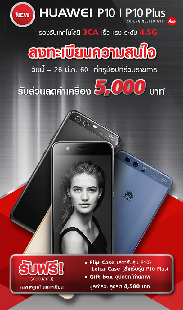 ด้าน TrueMove H เปิดให้ลงทะเบียนความสนใจ Huawei P10 และ P10 Plus ได้ตั้งแต่วันนี้ - 26 มีนาคม 2560 ที่ทรูช้อปที่ร่วมรายการ พร้อมรับส่วนลด 5,000 บาท และของแถมสุดพิเศษ
