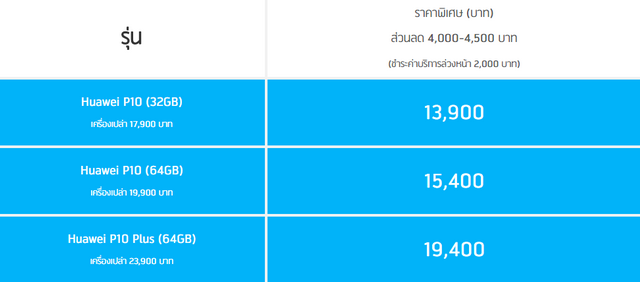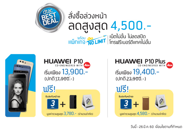 ส่วนทางด้าน dtac ให้คุณสั่งซื้อ Huawei P10 และ P10 Plus พร้อมข้อเสนอสุดคุ้ม ลดสูงสุด 4,500 บาท รับฟรีของแถมมูลค่ารวมสูงสุด 4,580 บาท พร้อมเล่นเน็ต4G ได้สูงถึง 16GB ตั้งแต่วันนี้ - 26 มี.ค. 2560