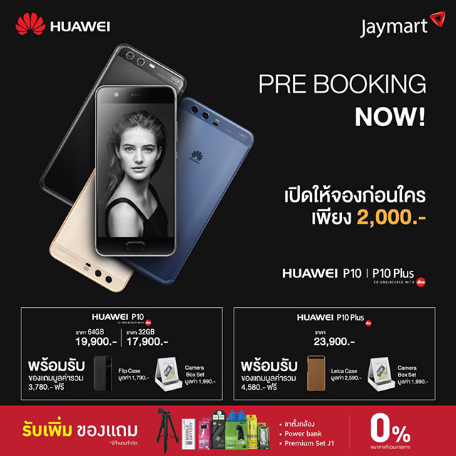 Jaymart เปิดจอง Huawei P10 และ P10 Plus มัดจำเพียง 2,000 บาท รับฟรี! Huawei Premium Box Set และรับเพิ่มของแถมพิเศษจากเจมาร์ท พร้อมผ่อน 0% กับบัตรที่ร่วมรายการ สนใจจองสินค้าได้ที่ เจมาร์ท ทุกสาขา หรือ จองผ่านช่องทางออนไลน์ได้ที่ www.jaymart.co.th/PrebookingHuaweiP10