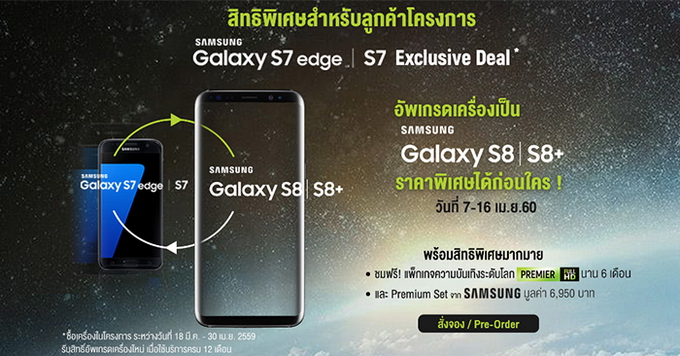 ข้อเสนอพิเศษสำหรับลูกค้าที่ชื้อเครื่องโทรศัพท์ Samsung Galaxy S7 edge หรือ S7 ในแคมเปญ Exclusive Deal ระหว่างวันที่ 18 มี.ค. - 30 เม.ย. 2559 ให้นำเครื่องโทรศัพท์ Samsung Galaxy S7 edge หรือ S7 เครื่องเดิมมาแลกซื้อ Samsung Galaxy S8 หรือ S8+ ได้ในราคาพิเศษ พร้อมรับ ส่วนลดค่าบริการรายเดือน 888 บาท นาน 10 เดือน เมื่อสมัครแพ็กเกจ 4G Max Speed 888/1288/1888 หรือ iEntertain Non-Stop 899 (สัญญาใช้บริการ นาน 12 เดือน) พร้อมรับสิทธิ์ผ่อน 0% นาน 10 เดือน สามารถไปศึกษารายละเอียดเพิ่มเติมได้ในลิงค์นี้ครับ samsung-galaxy-s8/exclusivedeal