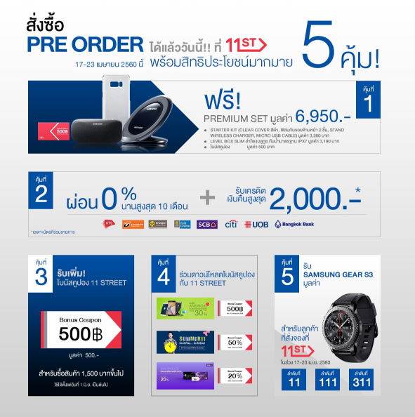11street เปิดจอง Samsung Galaxy S8 และ Galaxy S8+ แจกฟรี Samsung Gear S3 สำหรับออเดอร์ที่ 11, 111 และ 311 พร้อมรับเครดิตเงินคืนและของแถมมูลค่าสูงสุด 9,950 บาท เริ่มพรีออเดอร์ได้ตั้งแต่ 17 เมษายน 2560 เวลา 09:00 น.