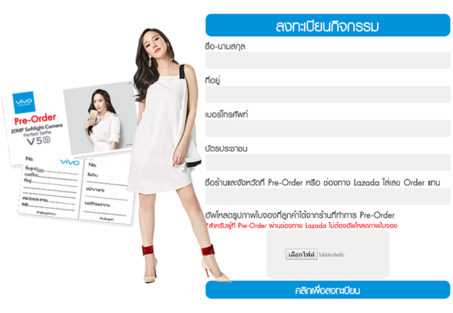 - อัพโหลดภาพใบจอง พร้อม ชื่อ-นามสกุล ที่อยู่ เบอร์โทรศัพท์ เลขบัตรประชาชน และร้านค้าที่ทำการจอง Pre-Order ในเว็บไซต์ www.vivo.co.th/v5saroundtheworld (สำหรับผู้ที่ Pre-Order ผ่านช่องทาง Lazada ให้ใส่เลขที่ Order แทนการอัพโหลดภาพใบจอง)