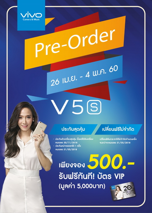 - จองสมาร์ทโฟน Vivo รุ่น V5s ตั้งแต่วันที่ 26 เมษายน ถึง 4 พฤษภาคม 2560