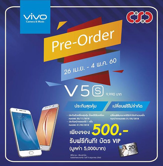 CSC Shop ให้คุณเป็นเจ้าของสมาร์ทโฟน vivo V5s ก่อนใคร พร้อมรับของแถมแบบจัดเต็มสุดๆ ตั้งแต่วันที่ 26 เมษายน - 4 พฤษภาคม 2560 สามารถสอบถามรายละเอียดได้ที่ CSC Shop ทุกสาขา