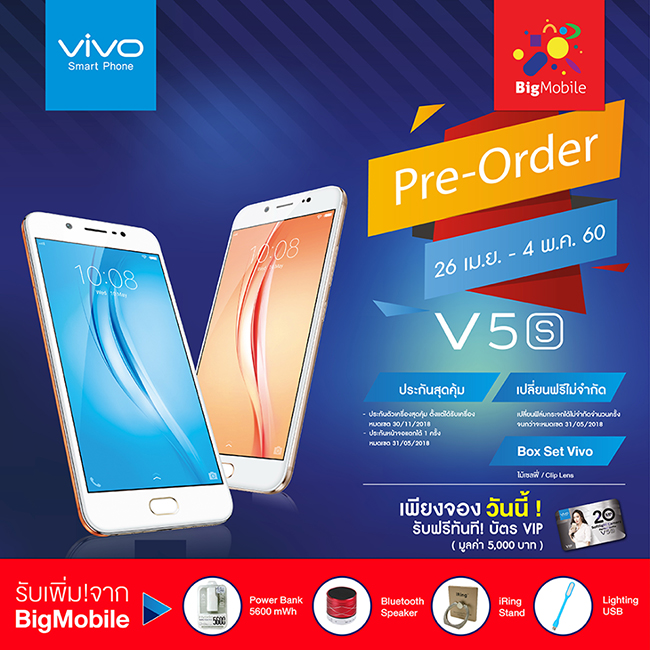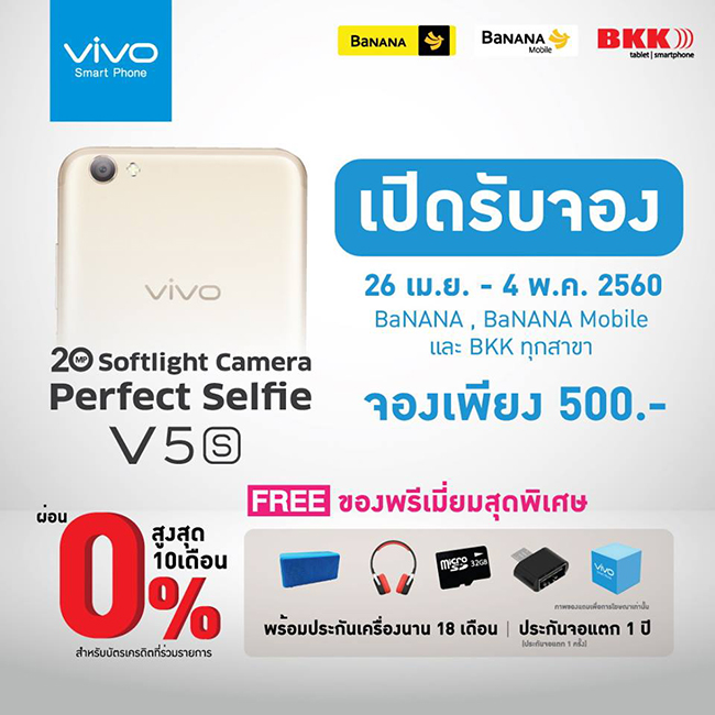 จองสมาร์ทโฟน Vivo V5S กับ Banana IT หรือ Banana BKK ทุกสาขา ตั้งแต่วันที่ 26 เม.ย - 4 พ.ค. รับฟรี ของสมนาคุณพิเศษ (ค่ามัดจำเพียง 500 บาท) โดยสามารถรับเครื่องได้ในวันที่ 5 พ.ค. 2560 เป็นต้นไป (สอบถามรายละเอียดเพิ่มเติม ณ จุดขาย)
