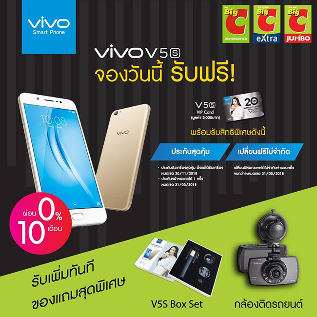 สิทธิพิเศษเฉพาะลูกค้าจอง V5s ที่ Big C Supercenter, Big C Extra, Big C Jumbo รับสิทธิ์ประกันตัวเครื่องนาน 18 เดือน และรับสิทธิ์ติดฟิล์มกระจกฟรีตลอด 1 ปี ไม่จำกัดครั้ง พร้อมประกันหน้าจอแตก 1 ครั้ง