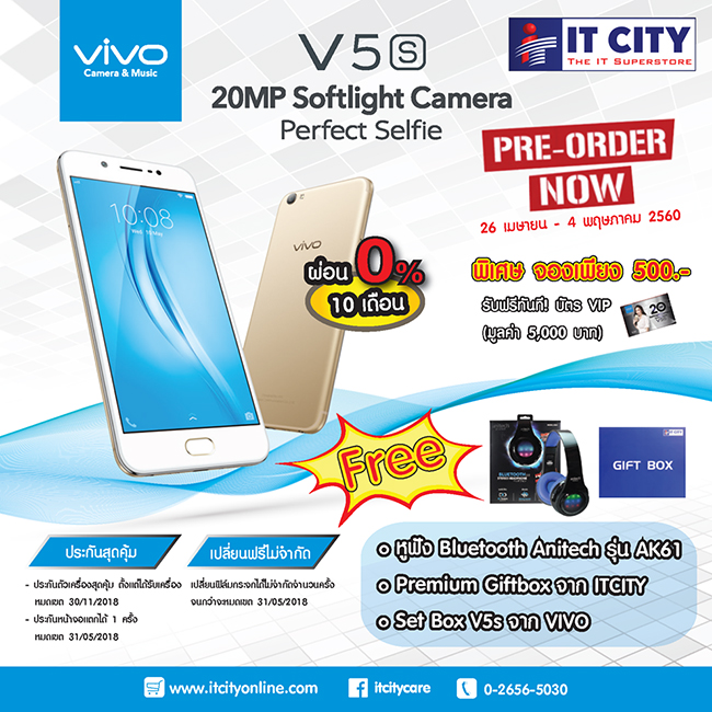 จอง V5s ที่ IT CITY วันนี้ รับหูฟัง Bluetooth anitech รุ่น AK61และ Premium giftbox จากทาง IT CITY พร้อมด้วย Set box v5s จาก Vivo พร้อมสิทธิพิเศษอีกมากมาย ตั้งแต่วันที่ 26 เมษายน - 4 พฤษภาคม 2560