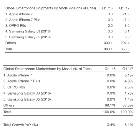 ทั้งนี้ สมาร์ทโฟนทั้ง 5 รุ่น คิดเป็นยอดจัดส่งสมาร์ทโฟน 6.1% ของทั้งหมด (ไตรมาสแรกปี 2017) เลยทีเดียวครับ เรามารอลุ้นไตรมาสถัดไปของปี 2017 กันครับว่าจะมีการเปลี่ยนแปลงไปในรูปแบบไหน เมื่อกองทัพสมาร์ทโฟนเรือธงเริ่มเปิดตัว และวางจำหน่ายกันแล้ว