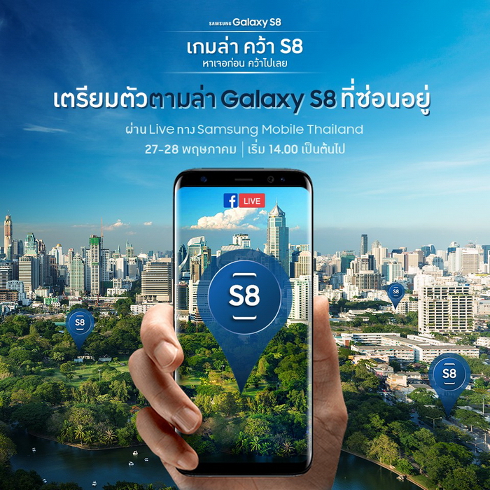ลุ้นเป็นเจ้าของ Samsung Galaxy S8 สมาร์ทโฟนที่เป็นที่ต้องการที่สุดในเวลานี้ กับ "เกมล่า คว้า S8" ที่ทุกท่านจะร่วมสนุกกับประสบการณ์การตามล่าหา Galaxy S8 ที่ซ่อนอยู่ทั่วกรุงเทพมหานคร ผ่านภาพ และคำใบ้จากการไลฟ์ทางเฟซบุ๊ก Samsung Mobile Thailand ระหว่างวันที่ 27 - 28 พฤษภาคม วันละ 2 ครั้ง ในเวลา 14.00 น. และ 17.00 น. เป็นต้นไป
