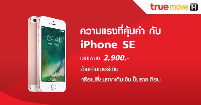 เป็นเจ้าของ iPhone SE ในราคาเริ่มต้นเพียง 2,900.- เมื่อซื้อพร้อมแพ็กเกจที่กำหนด จาก TrueMove H