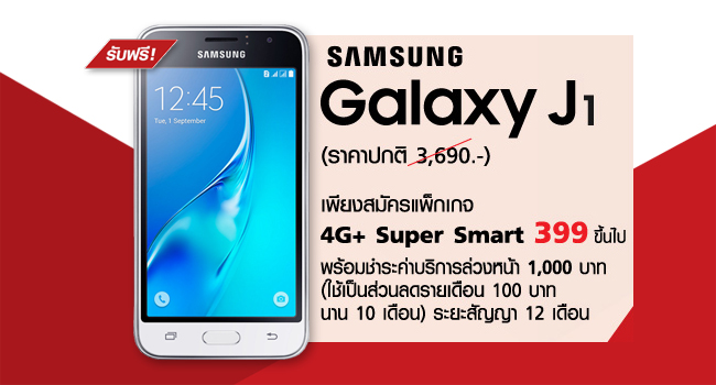 รับไปเลยฟรีๆ Samsung Galaxy J1 (2016) (ราคาปกติ 3,690 บาท) เมื่อสมัครแพ็คเกจ 4G+ Super Smart 399 บาทขึ้นไป พร้อมชำระค่าบริการรายเดือนล่วงหน้า 1,000 บาท (ใช้เป็นส่วนลดเดือนละ 100 บาท ยาวนาน 10 เดือน) ระยะเวลาสัญญา 12 เดือน