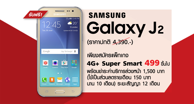 หรือเลือกรับฟรี Samsung Galaxy J2 (ราคาปกติ 4,390 บาท) เมื่อสมัครแพ็คเกจ 4G+ Super Smart 499 บาทขึ้นไป พร้อมชำระค่าบริการรายเดือนล่วงหน้า 1,500 บาท (ใช้เป็นส่วนลดเดือนละ 150 บาท ยาวนาน 10 เดือน) ระยะสัญญา 12 เดือน