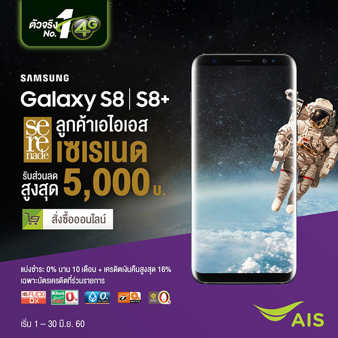สิทธิพิเศษสำหรับ เอไอเอส เซเรเนด เมื่อซื้อสมาร์ทโฟน Samsung Galaxy S8 และ Samsung Galaxy S8+ ที่ AIS Online Store รับส่วนลดสูงสุด 5,000 บาท โดยไม่ต้องเปลี่ยนแพ็กเกจ พร้อมแบ่งชำระ 0% นาน 10 เดือน และรับเครดิตเงินคืนสูงสุด 16% จากบัตรเครดิตที่ร่วมรายการ