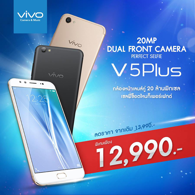 Vivo V5 Plus สมาร์ทโฟนกล้องหน้าคู่ 20MP เอาใจคนรักการเซลฟี่ ด้วยราคาสุดพิเศษเพียง 12,990 บาท