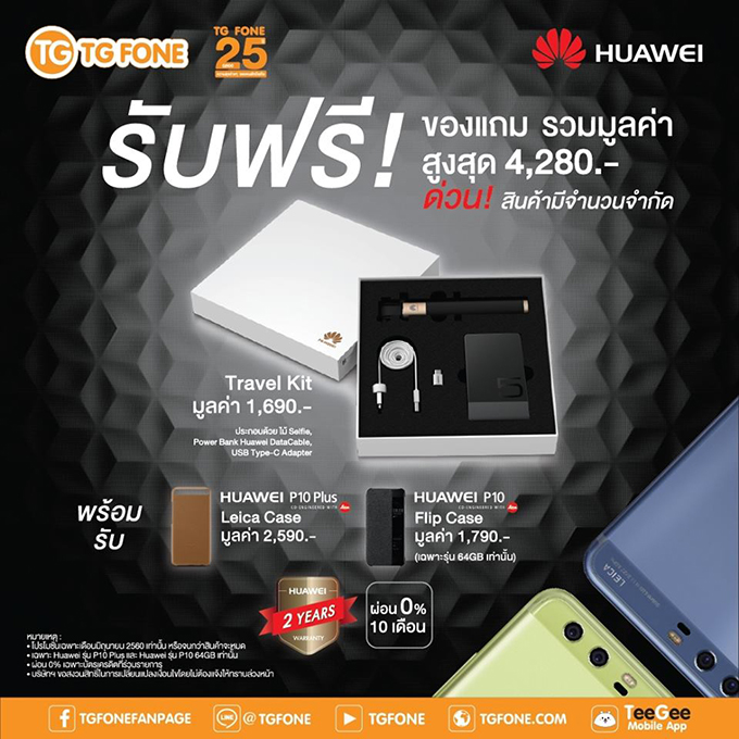 ซื้อ Huawei P10 และ Huawei P10 Plus รับฟรี ของแถมมูลค่ารวมกว่า 4,280 บาท ที่ TG Fone