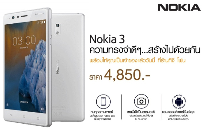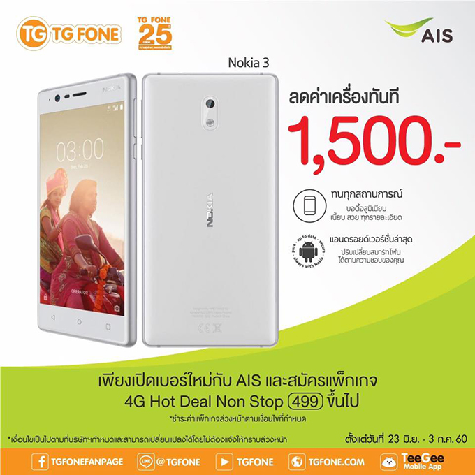 TG Fone พร้อมให้คุณเป็นเจ้าของสมาร์ทโฟน Nokia 3 ก่อนใคร ในราคาเพียง 4,850 บาท พิเศษ! รับส่วนลดค่าเครื่องทันที 1,500 บาท เพียงเปิดเบอร์ใหม่กับ เอไอเอส พร้อมสมัครแพ็กเกจ 4G Hot Deal Non Stop 499ขึ้นไป (ชำค่าบริการล่วงหน้าตามเงื่อนไขกำหนด)