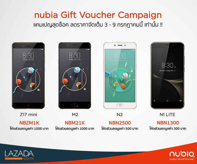 Nubia จับมือ Lazada ในแคมเปญ "Electronics Super Brands อิเล็กทรอนิกส์ แบรนด์ดัง ไม่ปัง ไม่เอามาลง" จัดเต็มกับแคมเปญ Gift Voucher สุดช็อค! มูลค่าสูงสุด 1,000 บาท กับ 4 รุ่นสุดฮอต ได้แก่ Nubia Z17 Mini, Nubia M2, Nubia N2 และ Nubia N1 Lite เพียงนำโค้ดไปใส่ในช่อง "กรอกคูปองส่วนลด" ก่อนการชำระเงินใน Lazada Store ก็จะได้ส่วนลดจากแคมเปญนี้ทันที! (โค้ดมีจำนวนจำกัด)