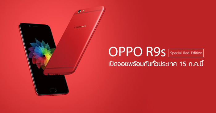 OPPO เปิดสั่งจองสมาร์ทโฟน OPPO R9s Special Red Edition ในวันที่ 15 ก.ค. นี้เป็นต้นไป ที่ OPPO Brandshop ทั้ง 70 สาขาทั่วประเทศ และเปิดวางจำหน่ายอย่างเป็นทางการ 22 ก.ค. 2560 ในราคา 13,990 บาท ใครที่ต้องมนต์สะกดของสีแดงไม่ควรพลาด โดยจะวางจำหน่ายแบบจำนวนจำกัด หมดแล้วหมดเลย