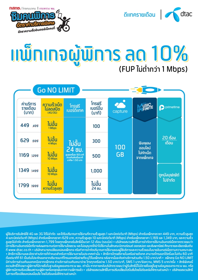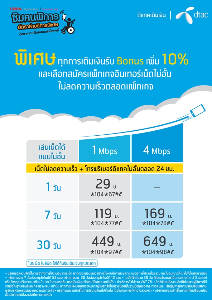 ทั้งนี้ ผู้พิการจะต้องมีรายชื่ออยู่ในระบบคนพิการของรัฐ โดยผู้พิการจะสามารถรับสิทธิได้ 1 สิทธิต่อ 1 คนต่อ 1 ผู้ให้บริการ โดยทุกการเติมเงินของลูกค้าในระบบเติมเงิน จะได้รับโบนัส 10% จากราคาที่เติมเงิน และ กำหนดความเร็วในการใช้อินเทอร์เน็ตอย่างน้อย 1 Mbps ส่วนผู้ใช้บริการในระบบรายเดือน จะได้รับส่วนลด 10% จากค่าบริการของแพ็กเกจหลัก โดยกำหนดความเร็วในการใช้อินเทอร์เน็ตอย่างน้อย 1 Mbps โดยผู้พิการสามารถขอรับสิทธิได้แล้ว ตั้งแต่วันนี้ ที่ศูนย์บริการและตัวแทนจำหน่ายของดีแทคทุกสาขา