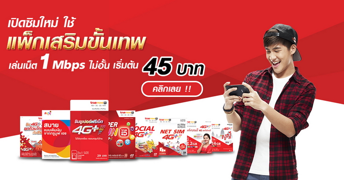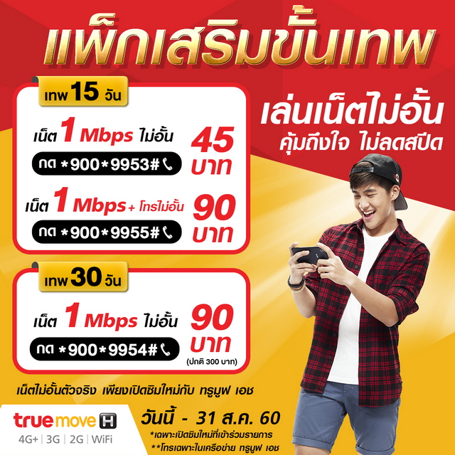 TrueMove H จัดเต็มแพ็กเสริม "ขั้นเทพ" เล่นเน็ตไม่อั้น ไม่ลดสปีด (ความเร็วสูงสุด 1Mbps) เริ่มต้นเพียง 45 บาท แพ็กเน็ตไม่อั้นตัวจริง แบบนี้ต้องไม่พลาด เพียงเปิดซิมใหม่แบบเติมเงินวันนี้ รับสิทธิซื้อทันที วันนี้ - 31 สิงหาคม 2560